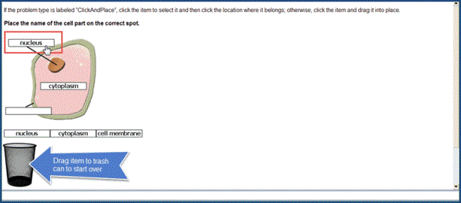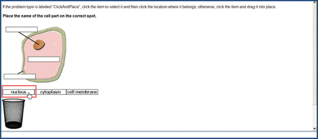 Note: Be careful not to "stack" one item over another, or the problem may be graded as incorrect. If an item is dragged to the wrong place, double-click it to pick it up and continue dragging it to its correct location. Also, drag any item to the "trash can" to start over again.