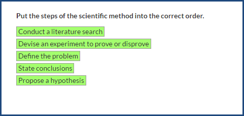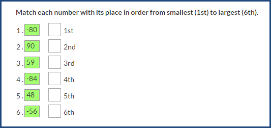 Sorting problems require students to select items and place them in the correct sort order based on the question. Examples of some typical sorting problems would be: putting a list of items into alphabetical order, or ranking numbers in order from largest to smallest.