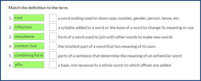 A drag and drop problem requires students to click an item - an image, a word, a phrase, a character - and drag it to its correct location. Sometimes, the student may drag an item onto a picture. For example, the student would drag the name of a city onto a map. Other times, the student might drag an item over a word or phrase to label the part of speech of a word.