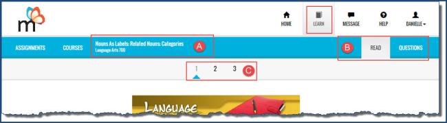 Read and Questions buttons. When the assignment opens you are on the Read page. This is where you find the body of your lesson - the text, your goals for the lesson, any media, vocabulary list, etc. Sometimes lessons are broken into sections. |