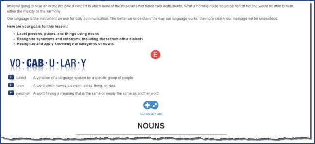 The body of the page (item E below) is the presentation part of the lesson. This is the part you need to read. It may have videos and slide shows to watch, pictures to see and vocabulary and spelling words to practice. Most lessons have one or more vocabulary words used in the lesson. You should become familiar with all of these words. Each of the vocabulary words is recorded.