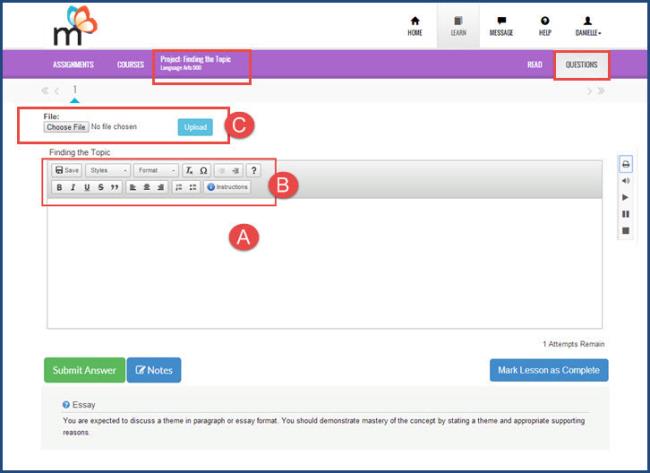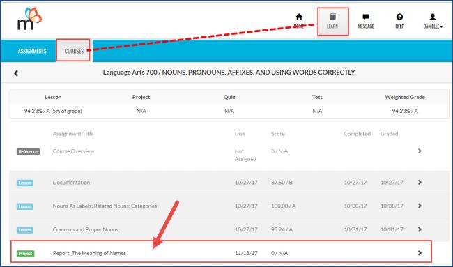 There are a couple of different kinds of project assignments, including essays and reports. Because project assignments allow one attempt, be sure you are ready to submit your work and mark the lesson as complete. Projects are graded by your teacher.